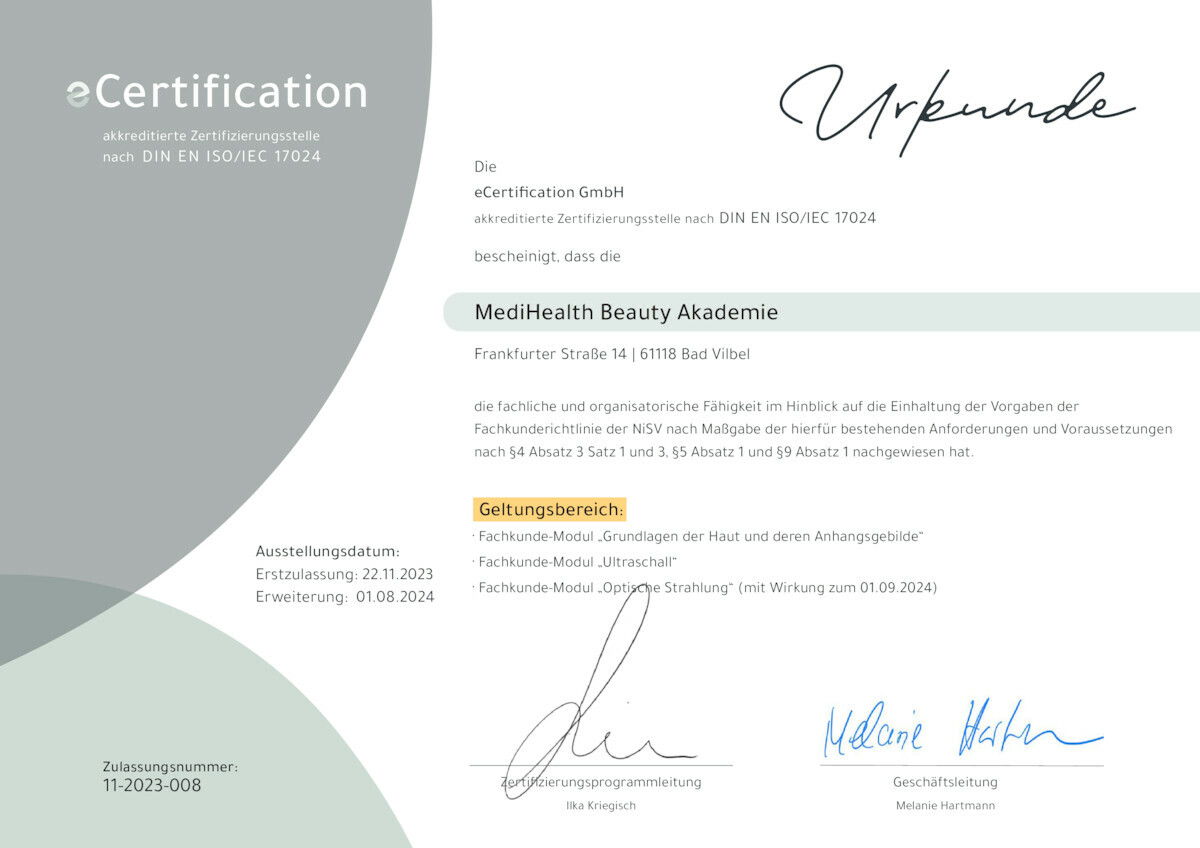 MediHealth Beauty Akademie ist Ihr Partner für innovative Hautpflegeausbildung. Wir helfen Ihnen, auf dem neuesten Stand der Technologie und des Wissens zu bleiben, damit Sie Ihren Kunden stets die besten Dienstleistungen bieten können. Kontaktieren Sie uns noch heute, um mehr über unser NISV-Programm und unsere Kosmetikschulausbildung zu erfahren. Treten Sie ein in die Welt der NISV und der Kosmetikinnovation mit MediHealth Beauty Akademie!